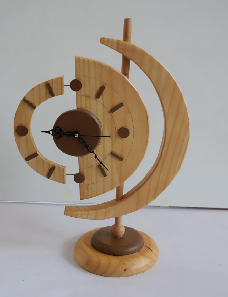 This clock features a distinctive semi-circular and circular layered design, showcasing the raw beauty of wood grain with a modern twist. The abstract geometric form, paired with a sleek minimal clock face and bold hour markers, makes it perfect for contemporary, rustic, and traditional interiors alike. The natural finish enhances its earthy warmth, while the sculpted top element adds a touch of uniqueness rarely seen in mass-produced decor.